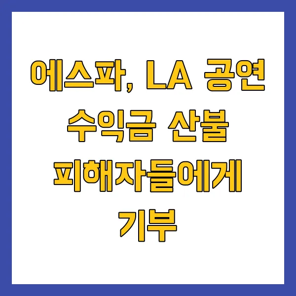 에스파는 LA에서의 공연 수익금 일부를 산불 피해자들에게 기부 하기로 결정했습니다. 이 결정은 에스파가 단순히 음악적 성과를 넘어 사회에 긍정적 영향을 미치기 위한 그들의 강한 의지를 나타냅니다. 멤버들은 "우리의 공연이 많은 사람들에게 기쁨을 주었듯이, 우리가 도움을 드릴 수 있는 기회를 준다면 기꺼이 실행할 것입니다"고 밝혔습니다.